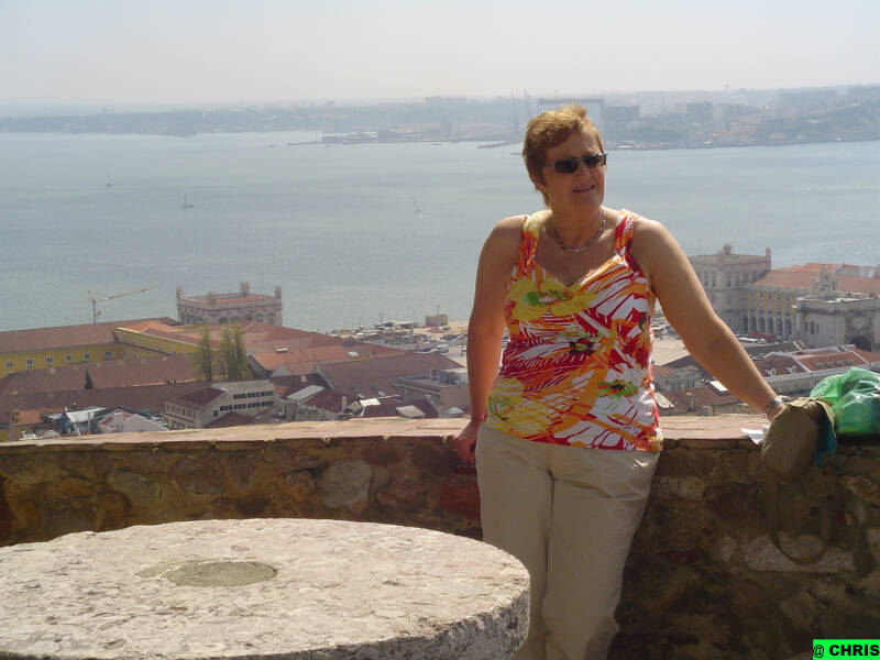We zien de benedenstad met de Baixa, de Chiado, de Taag met de Ponte 25 de Abril, de witte Basilica da Estrela, de Carmona-kerk zonder dak en verder ook het opvallende Amoreiras Shopping-Center. Het uitzicht is mooi en ik denk dat het tegen de avond nog mooier is, dan is het zonlicht minder fel.